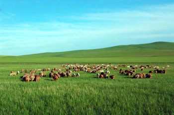 (舞台灯光渐亮,一片辽阔的草原映入眼帘,蓝天白云,牛羊成群。)